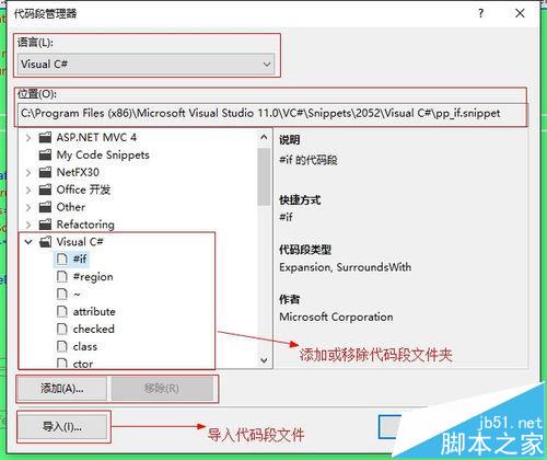 3、我們以“Visual C#”為例,選擇語言“Visual C#”下面的“Visual C#”文件夾,在“位置”一欄中會顯示“Visual C#”文件夾的路徑,在該文件夾下面存放著一些系統(tǒng)預定義的代碼段,例如:if、try、for等等代碼段。我們可以修改該文件下的代碼段文件。