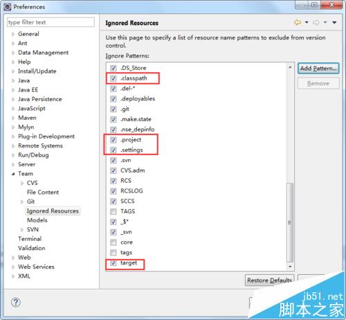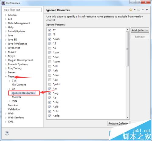 2、在彈出的對話框中找到Team提交選項下邊的Ignored Resources。