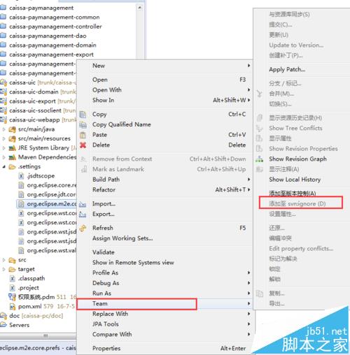 1、還有一種方法,直接在需要忽略的文件右鍵選中team選項,選擇添加至 svn:ignore即可,如圖: