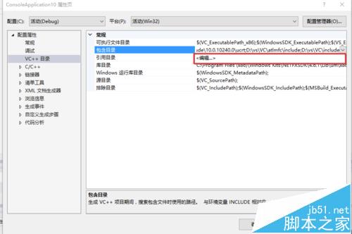 2、在打開的選項卡中選擇vc++目錄-->包含目錄下拉條點擊編輯