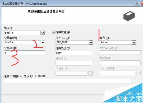 6、如下圖變量添加向導,1選擇Value,2選擇Double (方便計算小數)3,是變量名,我們選擇a,相同的方式,對上圖中的1,5,7分別添加變量,分別為工a,b,sum