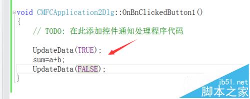 8、在這個函數中添加下面代碼,UpdataDate()函數中參數true表示從控件變量中獲取數值,false相反sum=a+b,就是我們先在控件中添加的三個變量,此處所做的計算器只是用來做個加法