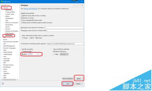 3、單擊“General”→“Workspace”,在“Text file encoding”中選擇“Other”→“UTF-8”,最后單擊“Apply”→“OK”即可。