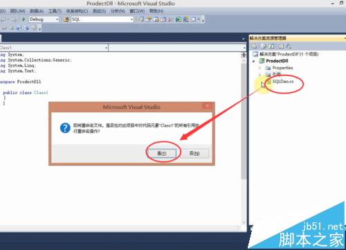 3、將類庫文件class1重命名為其他名稱,如這邊的SQLDao(自行名),然后在彈出的確認窗口中單擊確定。
