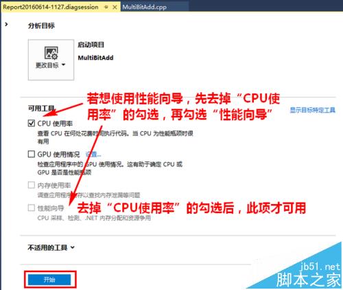 2、這時,將會打開向導窗口。請注意,在向導窗口中,默認“性能向導”一項是灰色的,無法勾選。若是想勾選此項,請先取消“CPU使用率”一項的勾選。取消以后,“性能向導”項就可以選擇了。不過,我們在此一般使用默認的選項即可。