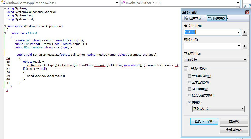 然后在vs2008中ctrl+H調出快速替換功能(下圖),查找范圍為當前文檔或者選中內容,選擇使用正則表達式,查找內容填入 ^:d:d:b ,替換內容為空就行啦,一鍵搞定。一般情況下行號是有1位到三位的數字,使用正則 ^:b@:Nu+:b 就能匹配了,這個的格式就是 行開頭+空格+多個數字+空格