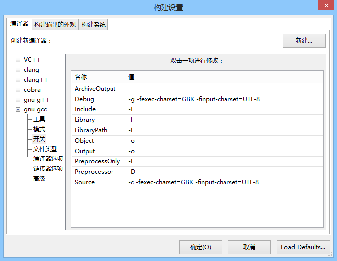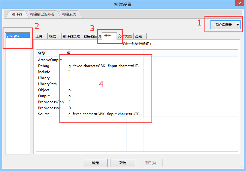 2.從菜單【設置->構建設置】進入構建設置頁面,選擇【編譯器->gnu gcc->開關】,修改Debug和Source的值,在其原值的后面加上 -fexec-charset=GBK -finput-charset=UTF-8,然后點【應用】。