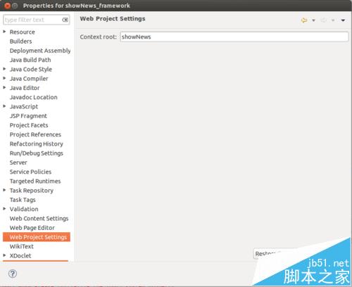 3、找到下面的Web Project Setting,注意看這里的Context root是不是你的項(xiàng)目名稱(chēng),比如我的就還是之前的項(xiàng)目名:showNews