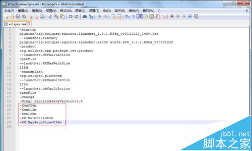 1、找到eclipse安裝路徑,在eclipse安裝目錄下有一個eclipse.ini的配置文件,這個配置文件是配置eclipse的運行內存之類的,修改配置文件之前最好做好備份工作,備份好了,打開配置文件,修改配置項,