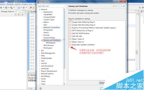 3、取消一些不必要的插件啟動,具體步驟是,打開eclipse,點擊上方的window,然后點擊preference,這時候會彈出一個新窗口,在搜索框輸入Startup ,或者手動去找General下面的Startup and Shutdown,點擊Startup and Shutdown,具體配置如下圖所示。