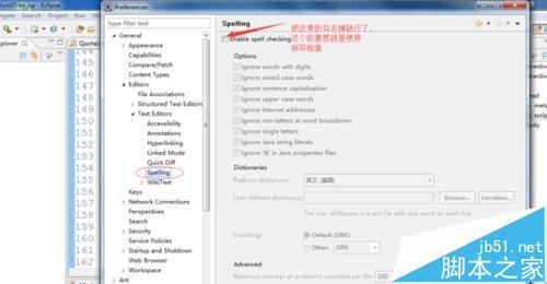 5、關閉拼寫檢查,步驟,點擊preferences,會彈出一個新的窗口,找到General/Editors/Text Editors/Spelling,點擊Spelling,具體配置如下圖所示。