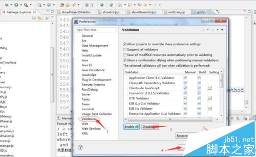 4、點擊preferences,會彈出一個新的窗口,找到Validation,點擊,默認的話右邊那些都會自動檢測的,所以我們一保存jsp就會自動檢測jsp語法,js語法,看看有沒有錯誤,這樣保存的時候就容易卡死,所以我們要把這些框框里面的勾全部去掉,就是選擇disable all ,全不選。然后apply,然后OK。