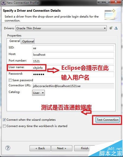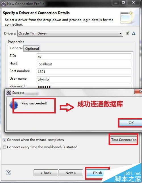 11、上步點擊“OK”后,會返回前一個窗口,這時,Eclipse會提示要求輸入"user name"用戶名,就是大家所建立的數據庫的名稱,不是任意起的名字。輸入后,可單擊下方的"Test Connection",當提示“Ping Successed!”時,表示Eclipse和oracle連接成功。然后單擊“Finish”完成配置。