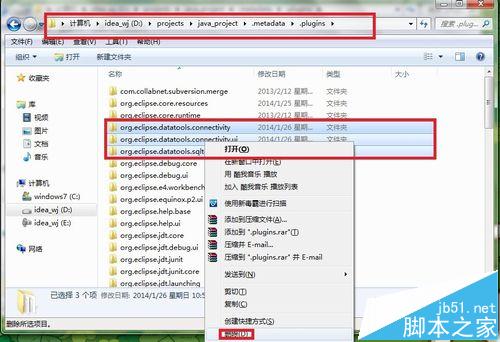 若想徹底刪除自己上面在Eclipse中所配置的數據庫相關信息,可在你的java項目文件夾中找到 D:/projects/java_project/.metadata/.plugins這一位置,然后選中“org.eclipse.datatools.connectivity”、“org.eclipse.datatools.connectivity.ui”、“org.eclipse.datatools.sqltools.result”這三個文件夾,并將他們刪除,然后重啟Eclipse,此時,原來數據庫配置的相關信息就不存在了,就可以重新進行配置。