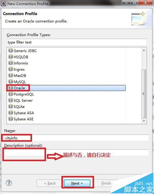 5、出現新窗口,找到自己正在使用的數據庫"Oracle",自行起個名字,小編在此起了"cityinfo"這個名字。然后單擊“Next>”。如下圖所示: