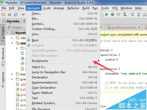 2、然后進行點擊Android studio的菜單中的“navigate”的選項中。
