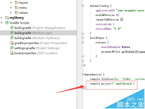 7、返回到Android studio的開發(fā)的界面中,選中g(shù)radle scripts的build.gradle之后,在build. gradle添加相應(yīng)的依賴代碼。