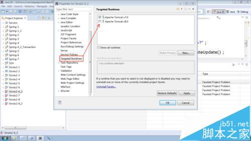 1、右鍵點擊【工程名】 → 【Properties】→ 【Targeted Runtimes】→ tomcat7.0的去掉對勾,tomcat8.0的打對勾。→ 【Apply】→ 【OK】,因為我的機子上安裝的是Tomcat8.0,所以要去掉上者,選中下者。