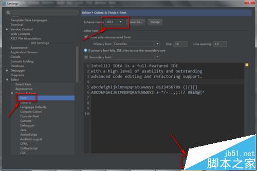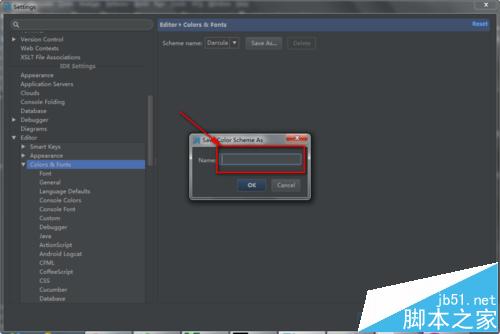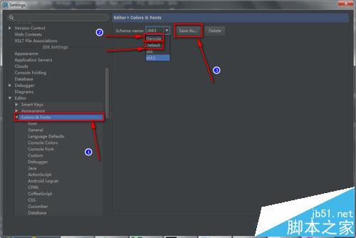 3、然后在Editor--->Colors&Fonts;會有兩種背景,一個是白的一個是黑色的,選擇一個,然后點擊保存成自己設的名字。