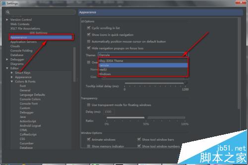 7、點擊Appearance進入選中四種中的一種背景,一般中間的兩種Intellij是白色,Darcula是黑色,選中一種點擊最下面的Apply應用。點擊OK。