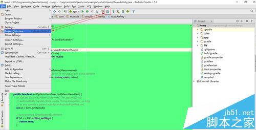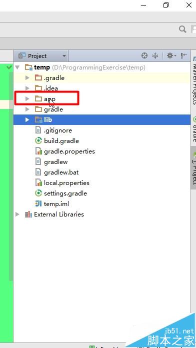 1、首先認識一下工程和模塊的組織結構圖,如圖所示,一個Project(temp)對應這兩個Module(app和lib,字體為黑體)。