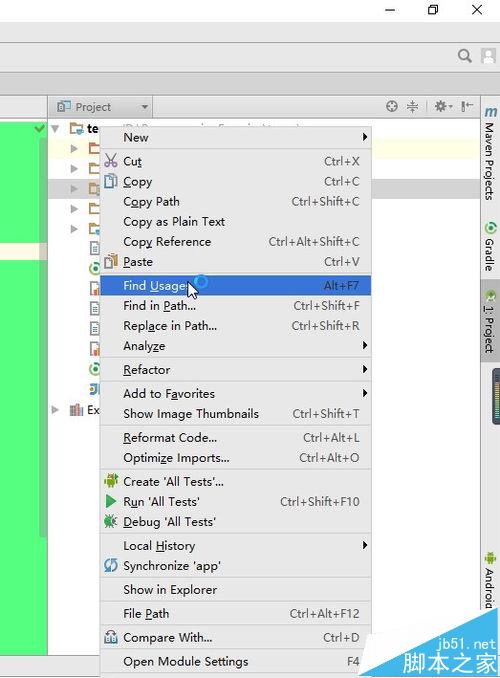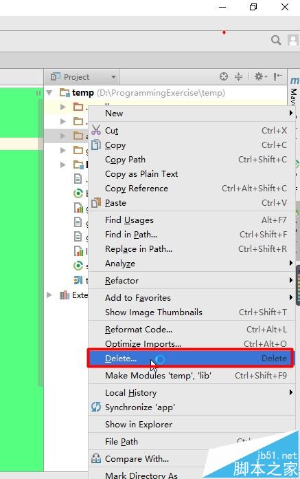 6、刪除完工程中的Module之后如果我們還想接著刪除工程,可是這時選擇工程,右鍵彈出菜單,我們發現這時候菜單中并沒有Delete的選項,那么這時候最簡單的方法就是關閉Android Studio,然后在硬盤中找到工程的文件夾,直接刪除即可。