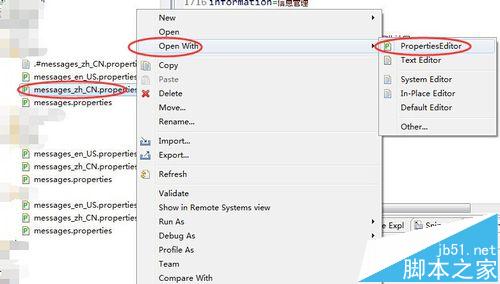9、此時在properties文件上點(diǎn)右鍵,點(diǎn)擊“Open With"-"PropertiesEditor",打開文件,現(xiàn)在就可以直接輸入中文了。