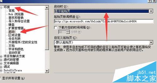 2、在環境-啟動-啟動時,選擇起始頁,確定后就好了,下次啟動就是起始頁