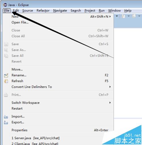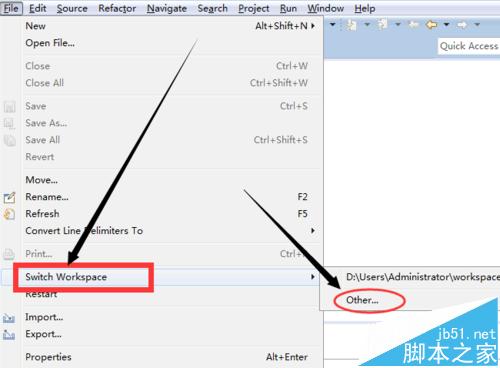 3、點擊File,在彈出的下拉菜單中,找到Switch Workspace,鼠標(biāo)移動到上面(不需要點擊),會在右邊彈出一個菜單,點擊彈出菜單中的other