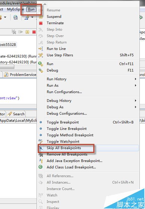 4、選擇run->skip all breakpoints。