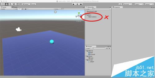 2、我們先來看看上面說的不可行的方法:如圖,直接將"Main Camera"拖動到"Sphere"的子目錄,即讓攝像機成為小球的子物體,這樣,兩個對象就可以一起運動了,那么我們來看看到底可不可行。