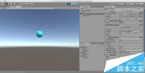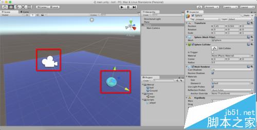 1、如圖,我們已經給小球添加了移動的腳本,小球是Sphere,現在想實現的是讓攝像機MainCamera跟隨小球一起運動。
