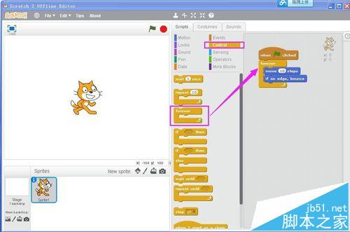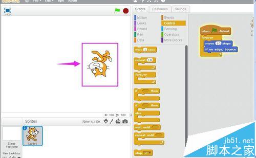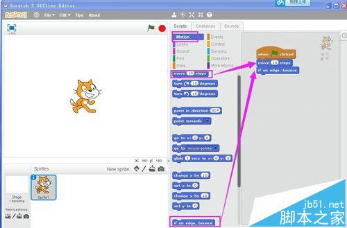 3、在Motion中將移動10步和碰到邊緣就反彈拉到右邊的腳本編輯區;