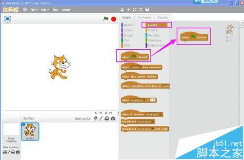 2、在Events中將“當綠旗被點擊時”拉到右邊的腳本編輯區;