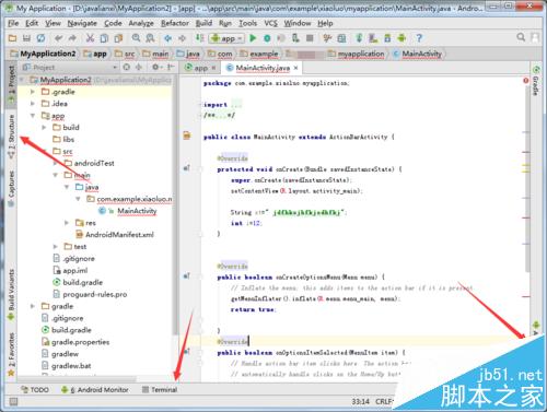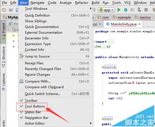 4、而在android studio工具的邊框中顯示的為工具條了,那么在由于屏幕較小時可以把這個工具條進行隱藏的,