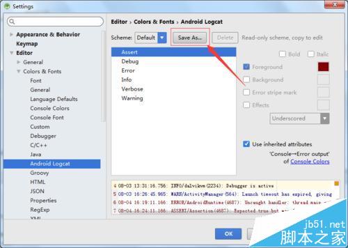 8、可以看到assert在logcat預覽中顯示為深藍的顏色。其它設置的設置也是類似。
