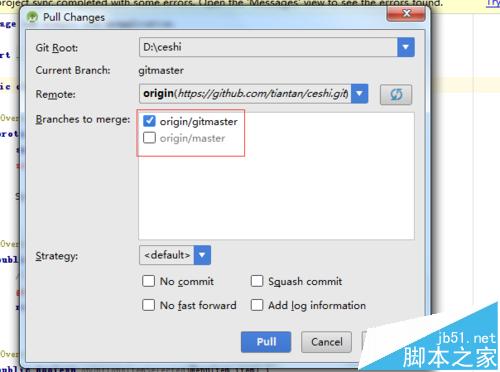 5、彈出了一個為pull charges的窗口中,在remote為本地倉庫分之,branches to merge中為遠程的分之。選中完成之后進行點擊“pull”的。