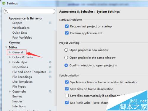 4、進入到了settings的選項中之后進行選擇為editor的選項展開之后,進行選擇為general的選項。