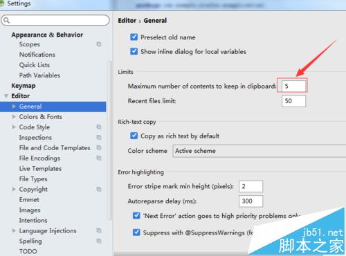 5、進入到了general的選項中之后,在limits中的maximum number of contents to keep in clipboard的更改為較大一點。例如改為8。