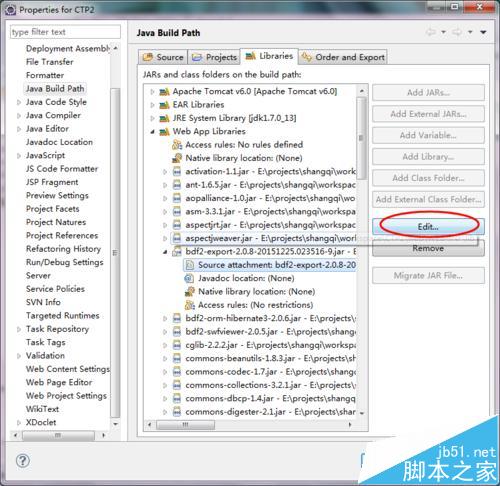 3、打開對話框中選中之前bdf2-export-2.0.8-20151225.023516-9.jar,展開選中source attachment節點,然后點擊右側Edit...,如圖