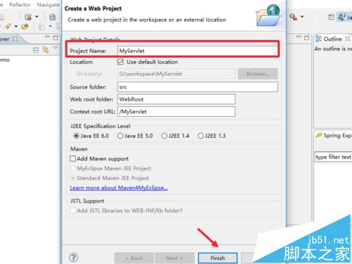2、在“Project Name”后的文本框中填寫項目名稱“MyServlet”,點擊“Finish”。