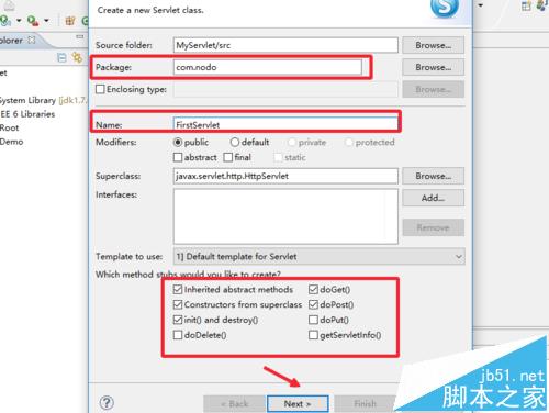 2、在打開的“Create Servlet”窗口中,在“Package”后的文本框中填寫“com.nodo”,在“Name”文本框中填寫Servlet的名稱,然后“Next”。