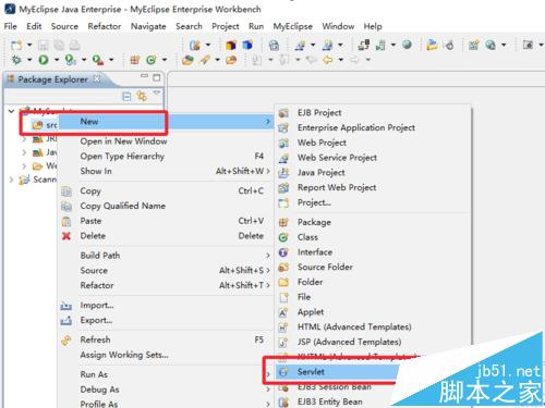 1、展開項目,選中“src”目錄,右鍵選擇“New”進入下級選項卡,選擇“Servlet”