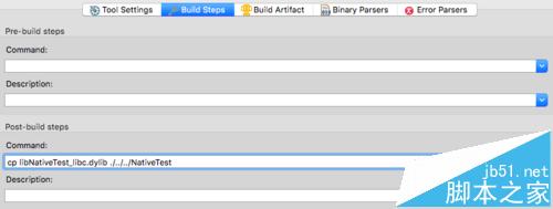 3)如圖設置編譯后動作(將編譯結果拷貝至java項目中)Windows:xcopy libNativeTest.dll ../../NativeTest