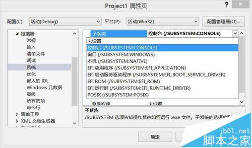 3、系統--->子系統(在窗口右邊)--->下拉框選擇控制臺(/SUBSYSTEM:CONSOLE)