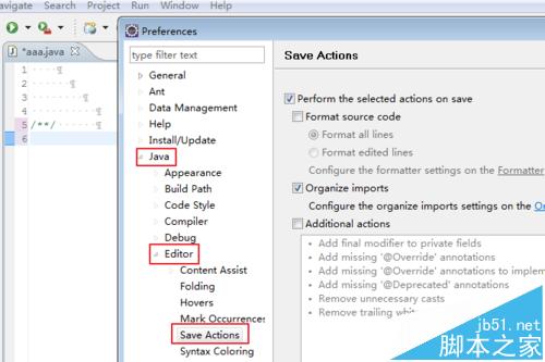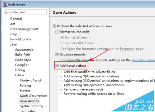 2、現(xiàn)在彈出的窗口就是JAVA開發(fā)人員常見的設(shè)置窗口了,我們依次點(diǎn)開【JAVA】>>【Editor】>>【Save Action】,最后把鼠標(biāo)點(diǎn)擊在【Save Action】上