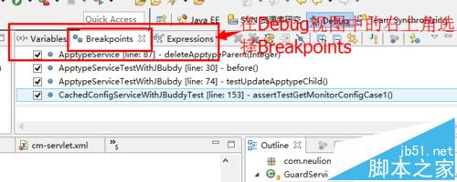 2、成功進入debug界面之后,從右上角找到breakpoint選項(三個選項中的中間一個)。