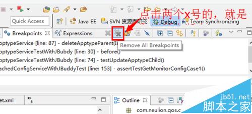 3、會看到一排圖標,一個X號的表示取消選擇的debug斷點,兩個X號的是取消所有斷點。選擇兩個X號的,點擊。