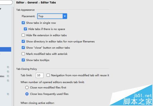 6、然后就可以對editor tabs中進行編輯器上標簽對顯示各項的設置,可以對顯示上位置中設置。