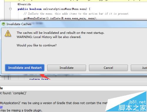 5、然后會彈出一個invalivdate caches的選項框中,根據提示進行確認,一般點擊“invalidate and restart”的選項。